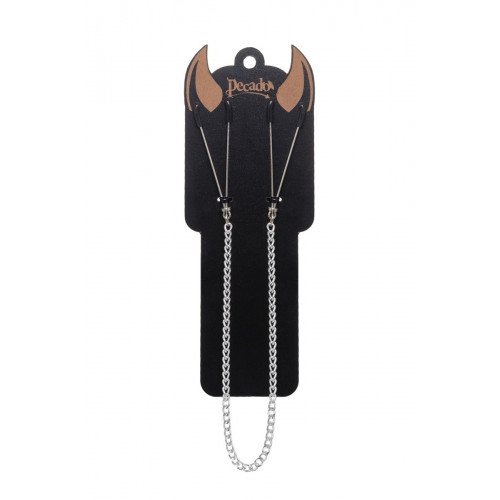 Зажимы-пилки на цепочке от Pecado только для тех, кто любит острые ощущения! Аксессуар из премиальных материалов подарит непередаваемую, взрывную гамму чувств. Соприкосновение холодного металла с нежной кожей сосков будоражит сознание. Основная, стальная часть атрибута компактная, тактильно приятная и ее удобно держать в руке. На концах черные резиновые наконечники, для безопасного воздействия на эрогенные зоны. Силу сжатия легко регулировать с помощью мини колец. В зависимости от личных предпочтений и сценария игры, можно выбрать легкое пощипывание, или сильное сдавливание. Подходят как женщинам, так и мужчинам. Зажимы соединены крепкой цепочкой. При каждом ритмичном покачивании груди, цепочка эротично движется и игриво звенит. А если за нее нежно потянуть, то можно увеличить бурлящий коктейль чувств от стимуляции. Попробуйте пикантный вид удовольствия с зажимом на цепочке от Pecado.