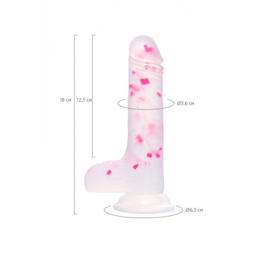 Необычный дизайн в виде прозрачного силикона с цветными вкраплениями идеально подходит для тех, кто не готов к супер-реалистичным игрушкам и хочет разнообразить сексуальную жизнь. Присоска позволит использовать игрушку на любых гладких поверхностях, освобождая руки для дополнительных ласк. Мошонка служит ограничителем, позволяя безопасно использовать фаллоимитатор на комфортную глубину. Рекомендуется использовать с лубрикантами на водной основе.