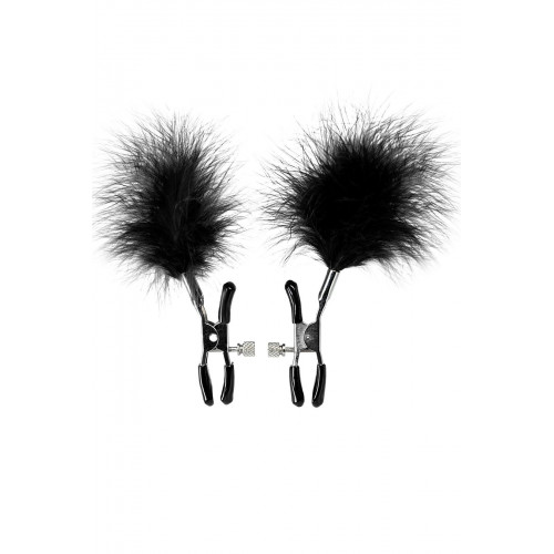 Пожалуй, самые милые из всех зажимов - украшенные перьями. Они стимулируют не только сжатием сосков, но и щекочут грудь. Сдавливание регулируется болтиком и может быть усилено или уменьшено во время интимной игры. Покрытие на концах зажимов защищает нежную кожу.