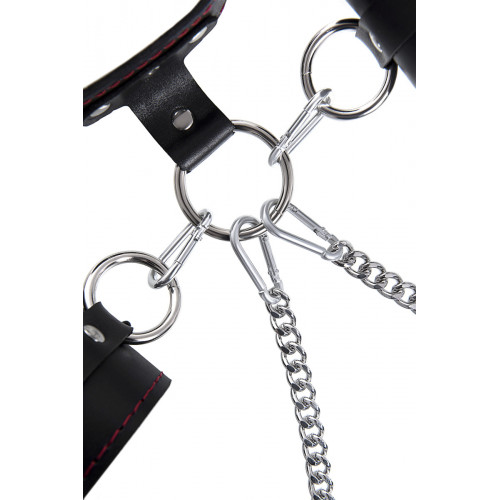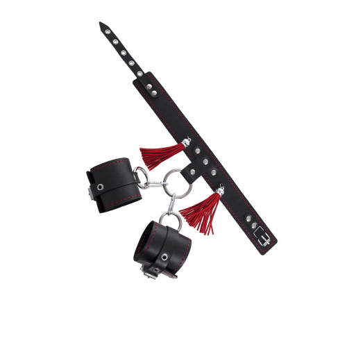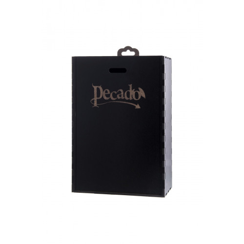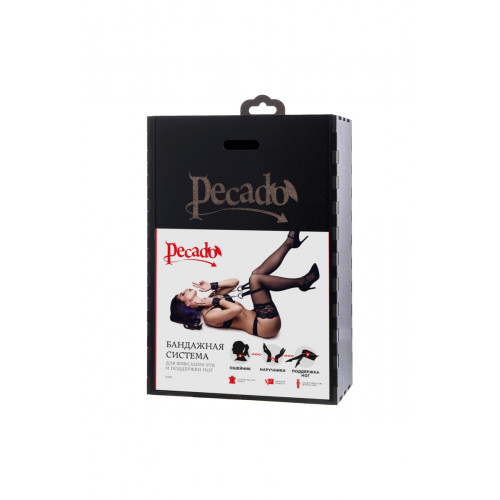 Бондажная система для фиксации рук и поддержки ног состоит из ошейника, пары фиксаторов для ног и пары наручников с контрастной строчкой красного цвета, всё это в фирменной деревянной коробке Pecado Bdsm. Кожаный ошейник соединяется с наручниками с помощью кольца и металлических карабинов. Фиксаторы для ног крепятся к кольцу ошейника металлическими цепочками с карабином. Кольцо на ошейнике позволит присоединить и другие аксессуары при помощи карабинов и экспериментировать с позициями и ощущениями. С этим комплектом расширить возможности и способы фиксации проще простого!