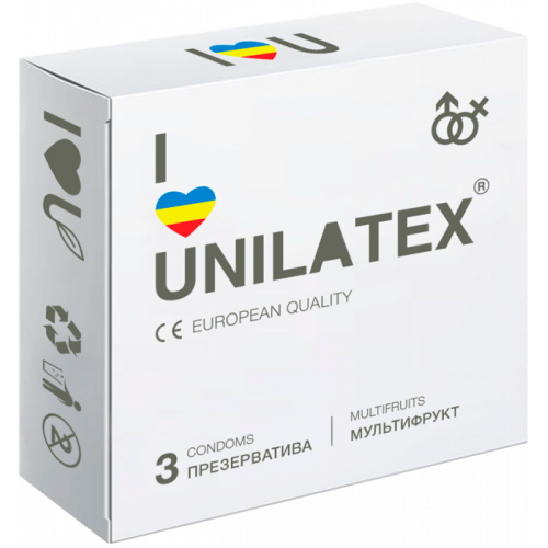 Unilatex® Multifruits. Упаковка 3 шт. Презервативы стандартного размера, гладкая поверхность, эргономичной формы, в натуральной гипоаллергенной смазке на основе силиконового масла, цветной латекс красного, желтого и синего цветов, с ароматом клубники, банана и мультифруктовым ароматом. Размеры - Длина 190 +/- 2 мм, ширина 54 +/- 2 мм, толщина 0,06 мм., наиболее универсальный размер, подходит более чем 90% мужчин.