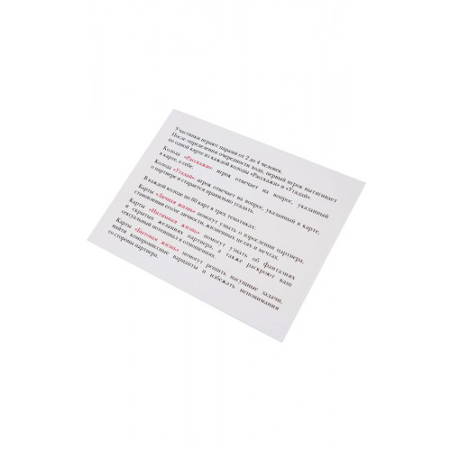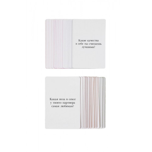 После определения очередности хода, первый игрок вытягивает по одной карте из каждой колоды «Расскажи» и «Угадай». Колода «Расскажи»: игрок отвечает на вопрос, указанный в карте, о себе. Колода «Угадай»: игрок отвечает на вопрос, указанный в карте, о партнере и старается правильно угадать. Карты «Личная жизнь» помогут узнать о взрослении партнера, становлении его/ее личности, жизненных целях и мечтах. Карты «Интимная жизнь» помогут узнать об фантазиях и скрытых желаниях партнера, а также раскроют ваш сексуальный потенциал в отношениях. Карты «Бытовая жизнь» помогут решить насущные задачи, найти компромиссные варианты и избежать непонимания со стороны партнера.